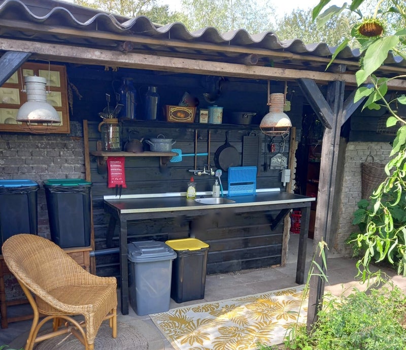 Verder vind je vooraan de camping onze sanitaire voorziening, er zijn 2 toiletten en een ruime badkamer, ook vind je hier de buitenkeuken met warm water. Er staan diverse pannen die speciaal geschikt zijn om te koken op vuur. Deze zijn uiteraard vrij te gebruiken. Verder vind je hier de vuilwater-stortplaats en de afvalbakken, en er staat een kast, gevuld met puzzelboekjes, tijdschriften en gezelschapsspelletjes.